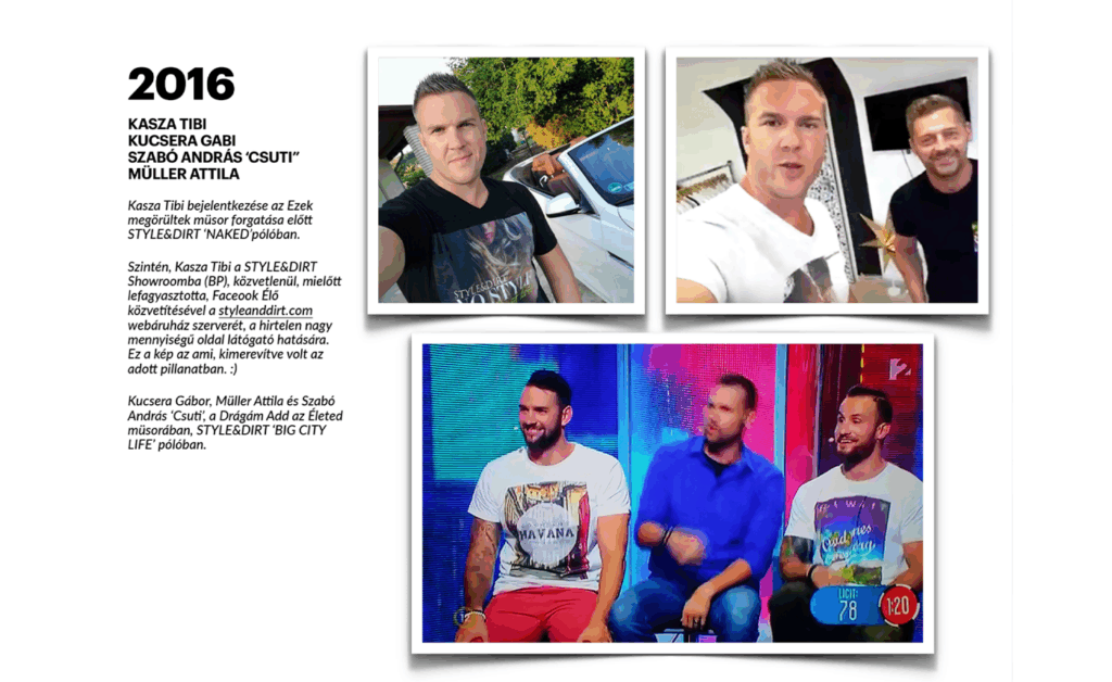- Kucsera Gabi, Müller Attila és Szabó András „Csuti” a Drágám, add az életed! műsorában, mindannyian STYLE&DIRT ‘Big City Life’ pólóban.